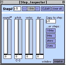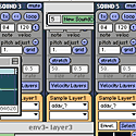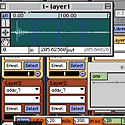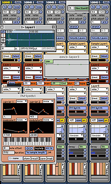 Now let's take a look at the Sounds you are sequencing. You can add as many sounds as your CPU can handle. A sound is composed of five stereo layers: three samples, an FM synthesizer, and a VST Instrument or Effect. These sources can be modifed with a multi-mode filter and delay. You don't have to use all of them, of course - you can use just one layer if you wish. The layers can be velocity-sensitive, or play all at once. They can play at a fixed pitch, or respond to MIDI pitches. The samples can be pitch-shifted and "stretched", using the granulator. Each sample has an envelope and waveform selector so you can fine tune your sounds. The FM Synth can be easily programmed with random methods. Simply start pressing certain keys on your Macintosh keyboard until you get a sound you like. If you'd rather be precise, you can adjust the carriers, modulators, and envelopes to your liking.