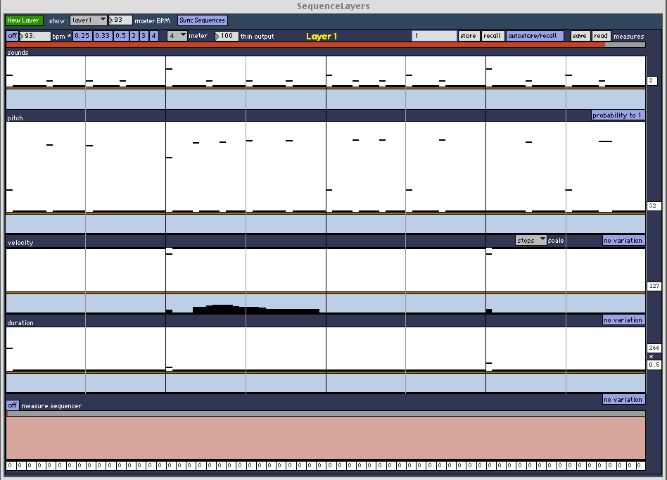 A looping measure is created in the Sequencer. The snare sounds and some of the clicks have a slight chance variation on the velocity,giving a different feel on each cycle of the measure's loop. The Sequencer's "thin output" for the measure is increased from 0 to 100, gradually exposing the rhythm. The FMSynth that is coupled with the click is faded in. Delays on the click and snare sounds are altered using the Mac keyboard controls. The Sequencer's "thin output" is reduced from 100 to 0.